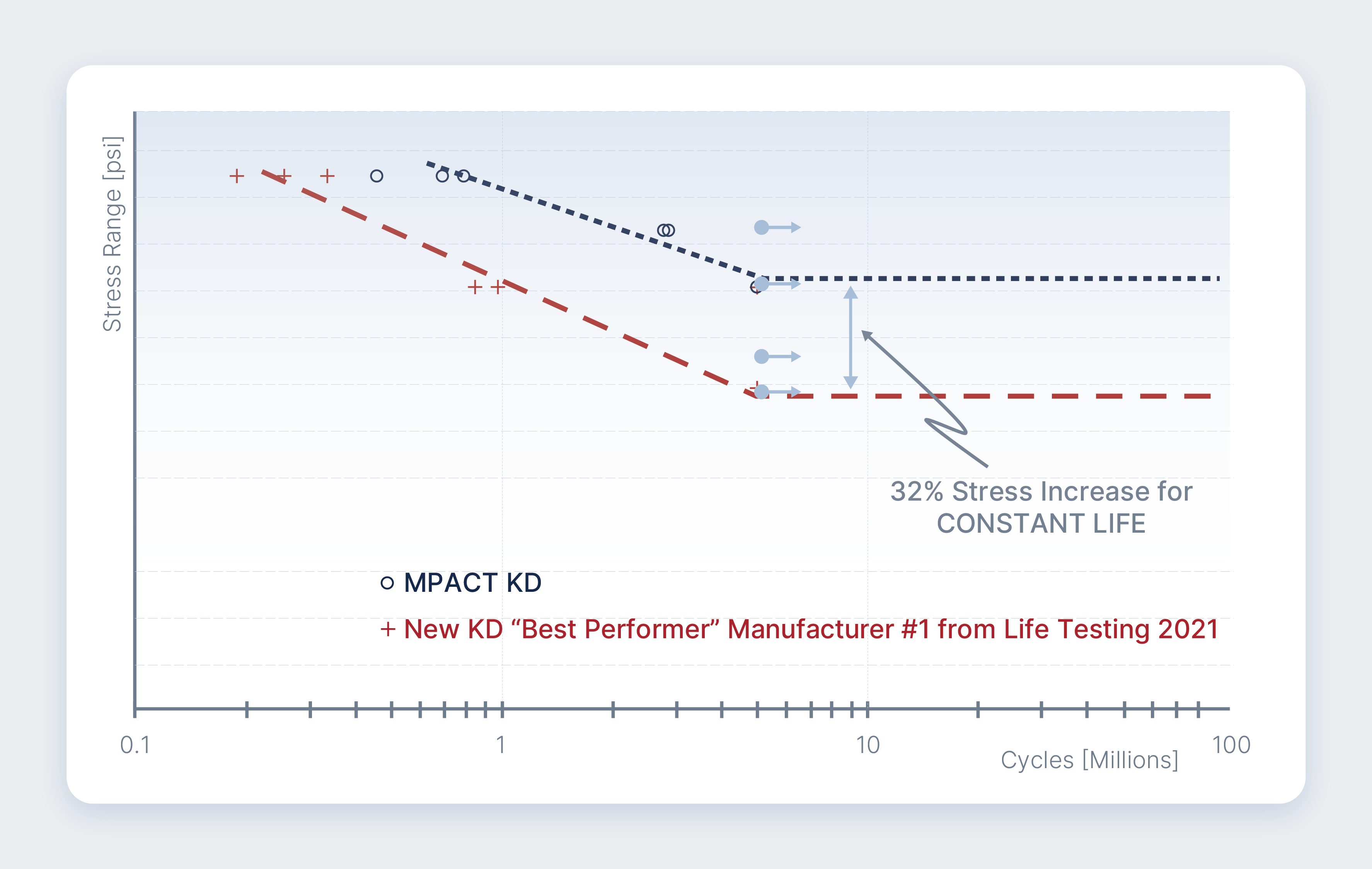 In fatigue testing, MPACT rods lasted 64% longer than untreated equivalents. On S-N curves, you see the separation clearly: The next best performing rods drop off quickly, while the MPACT-treated rods keep cycling. It’s proof that the compressive stress layer from advanced or engineered peening isn’t just marketing fluff.
